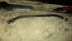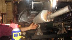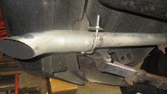 Enough time left for a few other minor details. Loosen a few clamps and rotate the muffler half a turn to correct the orientation, muffler up, pipe down, outlet at 2 o'clock equal space both sides. The makeshift rear hanger was nearly an inch to low, but we recon that can stay until it needs to be replaced. We also removed a pair of defective rebound straps, one broken, one stretched, and very little fiber inside, totally useless. More parts to order, maybe the aftermarket nylon ones this time.
