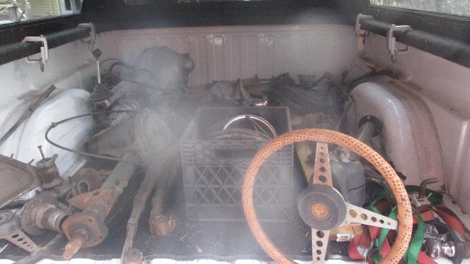 Early morning run to pick up a late model MGB 4-synchro overdrive gearbox (for a paltry $400). The seller was clearing out his shop space, and was happy to donate about one chassis equivalent worth of late model MGB parts, so we also brought back a Salisbury rear axle, pair of leaf springs, steering column, steering rack and all front suspension parts for a wire wheel MGB. We passed on the 1974 MGB engine with "L" head, all machining done (asking $400). Anyone need this stuff?
