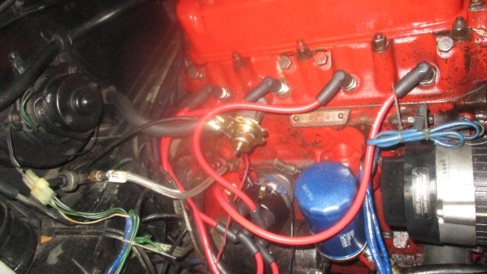 So jack it up, remove RR wheel, remove electrical cover from the fuel pump, clean the contact points to get the fuel pump running. Then it was dribbling fuel from the internal filter/drain plug. Apparently the DPM had cranked it up horrendously tight, but it still leaked. Dig up the correct metric socket and apply enough torque to extract the plug. Inside I found a red fiber washer, didn't look too bad, turned it over and reinstalled the plug, but it still leaked. Getting the doctor's bag from the magic trailer, after a few minutes I had no fiber washer that size, but I did find a copper washer in exactly the same size. Miracles never cease. That did the trick, back together with no fuel leak, reinstall the pump cover, connecting wire, wheel, and drop the jack. In a minute it was running, needing a fuel mixture adjustment, but otherwise peachy. Get the victory picture.