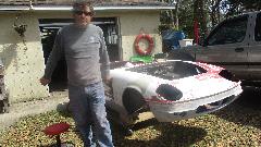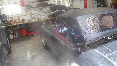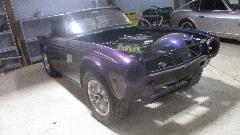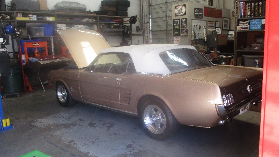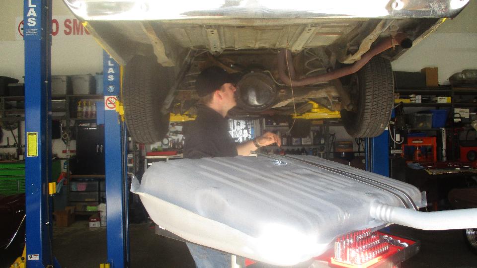Not sure if Kevin would actually fit in the Midget. He prefers the larger American cars, and leaves the British car work to his partner Tom Jenkins. Here he is stuffing a new fuel tank under an Oldsmobile Cutlass, with a nice '65 Mustang in another bay.