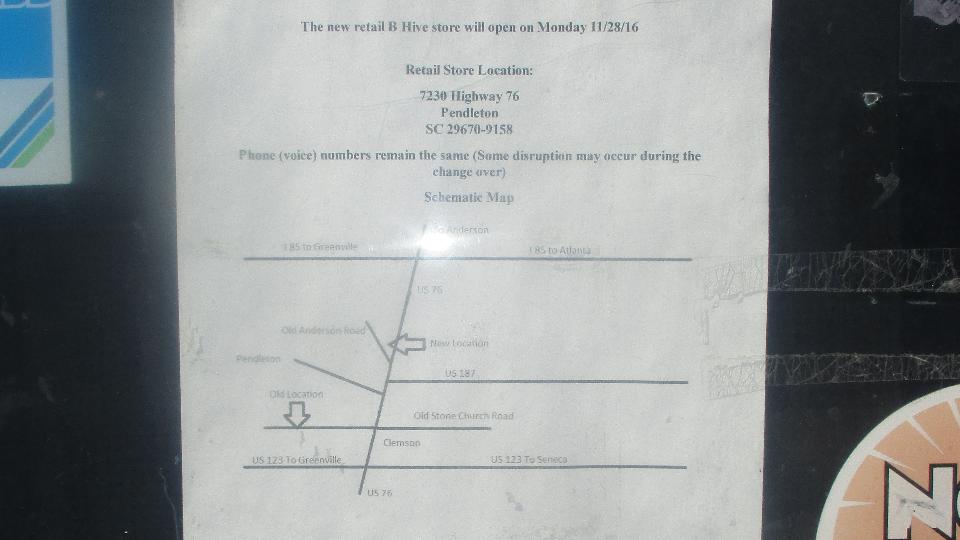 Then we were off to visit The B-Hive in Clemson, SC. We found the place locked up and phone number disconnected, but also found a note on the door saying they had moved 15 months earlier, and with a map to their new location. Arriving at the new shop, we found this one also to be locked up, but two new phone numbers on the door. A phone call revealed a voice message with business hours, but also noting they were closed on this particular Monday (one day only). At least they are still in business, and we can record their new address and phone numbers. I left a voice message, and we moved on.