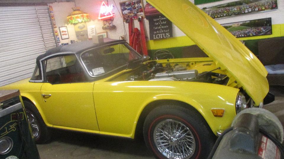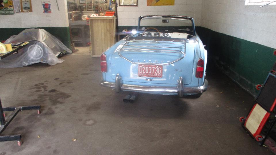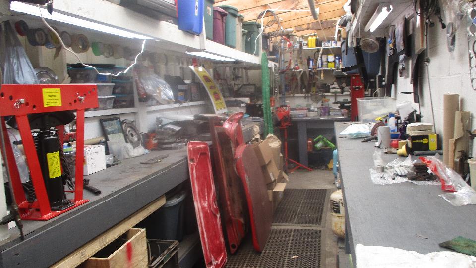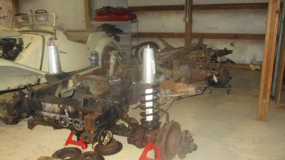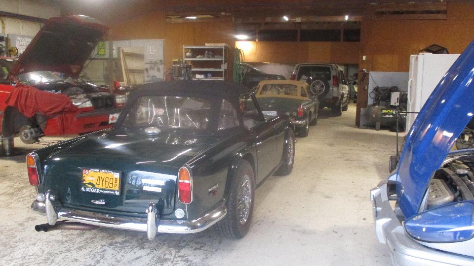 The blue TR4 is Robert's personal car, and his first car (constant ownership) with 600,000 miles (when he quit counting). There are a pair of engines for TR3 and TR4, and a shot of the machine shop extension in the back.