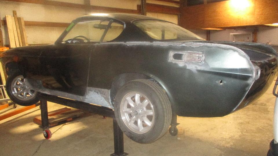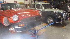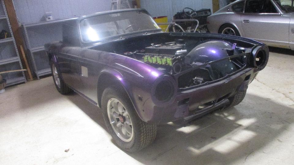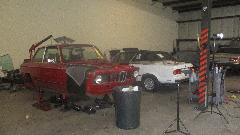 The Volvo P1800 came in for a little paint touch-up, but quickly escalated onto body sill repairs. The TR6 is about to be repainted from this funky metallic purple-green to a nice tame blue. Beyond the MG TD is Land Rover chassis (think real truck).