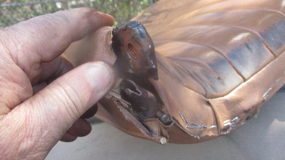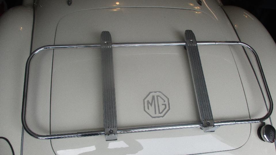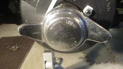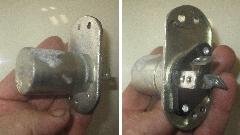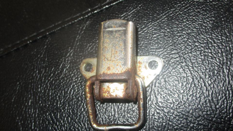 He also has a very nice MGC that looks like a show stopper to me. I was particularly interested in the "MG" branded windscreen glass that was a product of British Motor Industry Heritage Trust. They made "MG" glass for MGA as well, and it was noted for very high quality and good fit. There was this rag top center catch left over from the MGA restoration. First impression was tht it may be an original factory issue part worth its weight in gold, but on closer inspection, alas the "MG" symbol was right side up, meaning it was an aftermarket reproduction part. Yes, that's right, the original parts had the "MG" upside down as it was installed in the MGA.