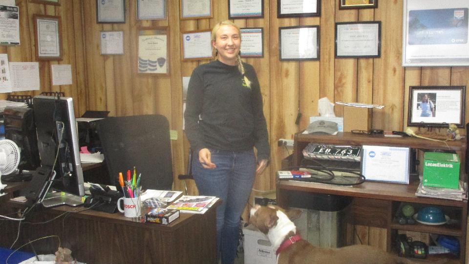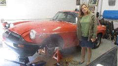 Without moving more than 10 feet in any direction, I found two MG TF, a Morgan on the lift, and a make believe Bugatti (for a man who loves expensive vintage cars but builds replicas for far less money). I liked the dog in the office (wait, was there a dog in that picture?). The lady is the office manager who will make your appointment.