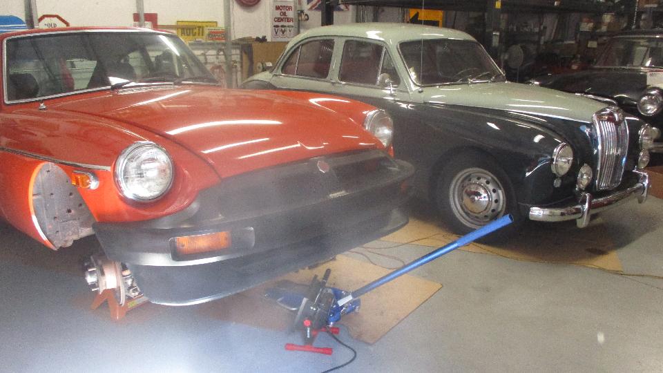 Behind this is the workshop with space enough for at least four cars. The late model MG MGB GT is lady's car, and she is disappointed because it is her daily diver and it is temporarily tied up for front suspension rebuild. She will have to drive the show car today (is that disappointing?). Along side is a beautiful MG ZB Magnette Varitone. Next over is a fairly rare MG Magnette Mk-III. On the rack is the MGA 1500 with older repaint, on the verge of running well enough to be driven.