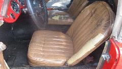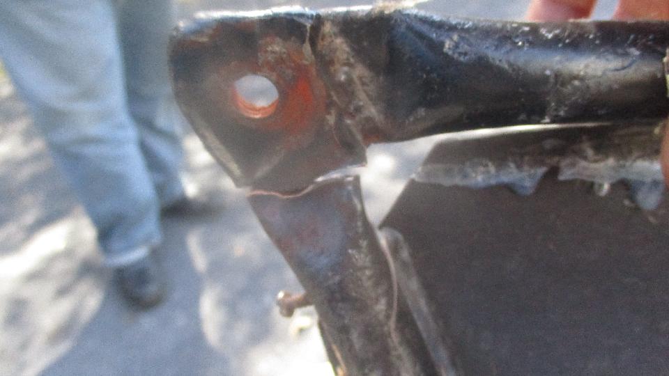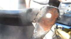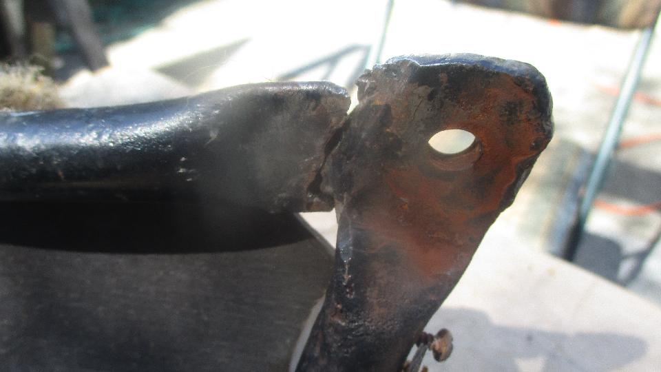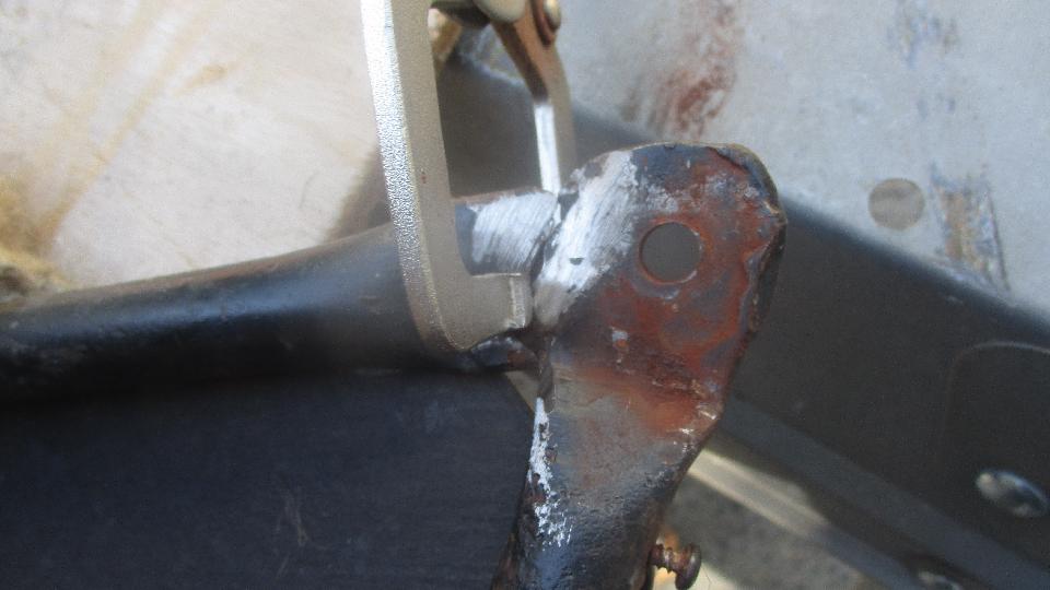 This morning I noticed my MGA driver seat backrest frame was broken near the pivot bolt. Been suspect for a while being a little wobbly and a bit too far laid back. Records show there was a welding repair here in November 2004. I guess 208,000 miles is not too bad since the last quickie repair. Wray had a MIG welder handy, so this seemed like a good opportunity to fix it before it got any worse. Just five minutes to lift the cushion and remove two lock nuts.