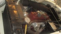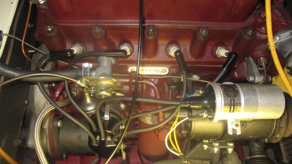 After some searching we found the thin brass disc used to connect the screw-in HT terminal on the ignition coil. Re-oriented some parts to get the coil solidly mounted, tightened the fan belt, got the heater valve adjusted to completely shut off, checking all the fluids. Beginning to be enthused about possible start up. A long ago Moss supplied battery ground cable was too short, so off to the parts store momentarily to buy a good one, and we soon had the new batteries hooked up (still needing the hold-down clamps).