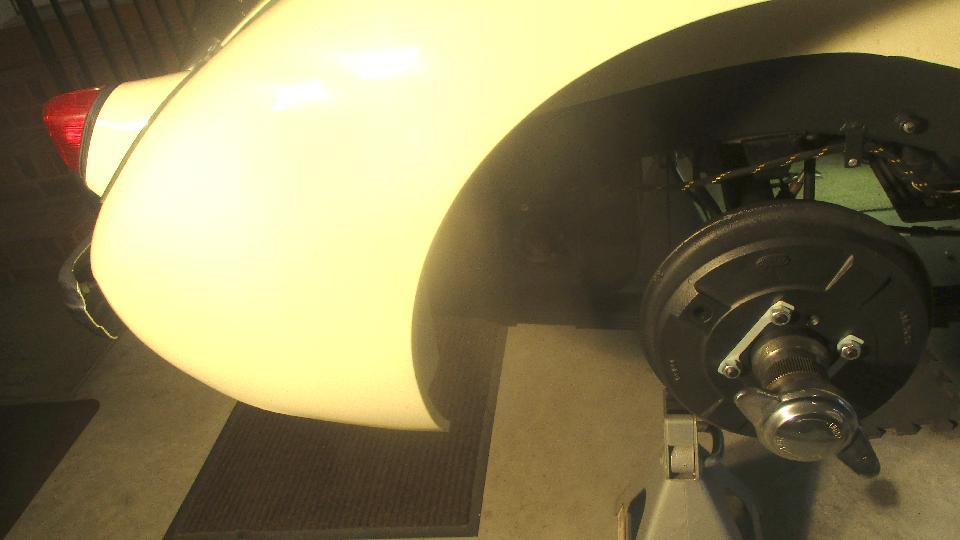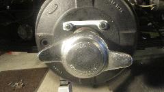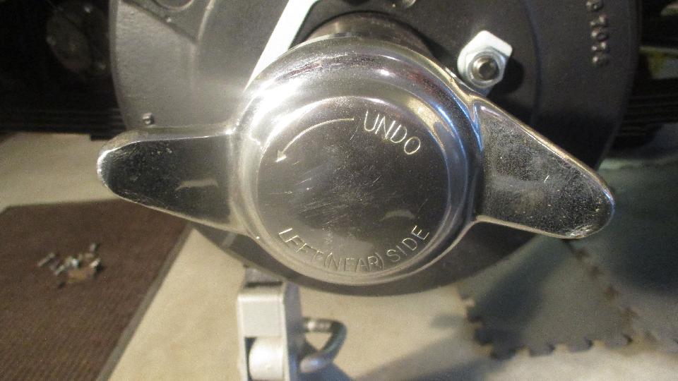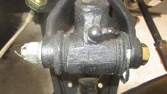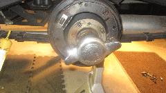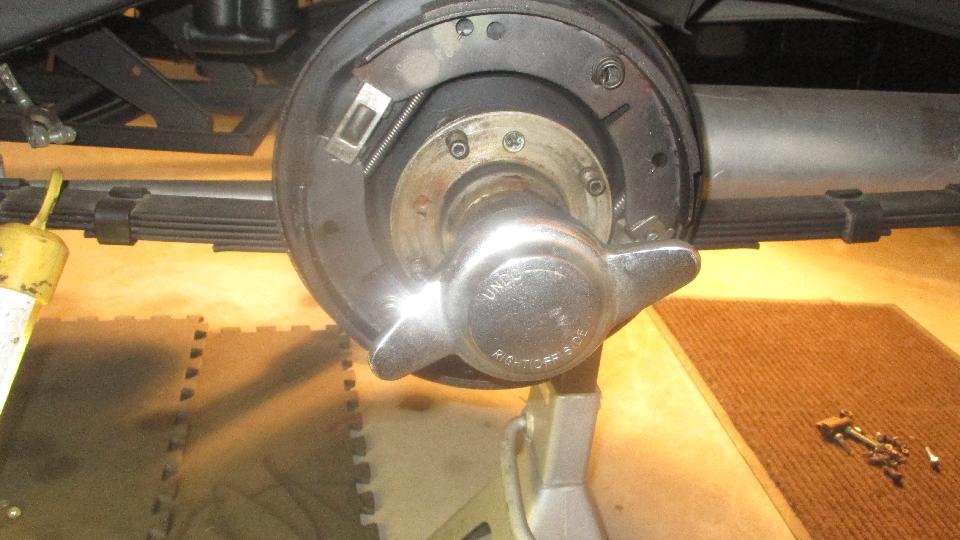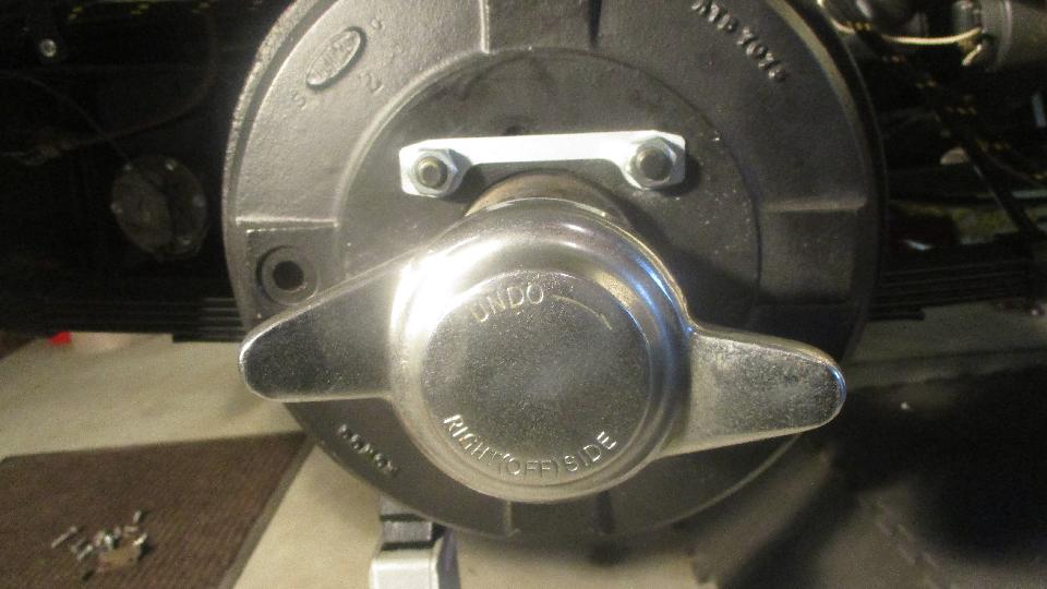 The rear knockoff nuts were on the wrong side of the car, so instead of self-tightening nuts there would be self-loosening wheels. Getting the priorities right, take the time now to swap the halfshafts to put the right hand threads on left side, and left hand threads on right side. After adjusting brake shoes and bleeding the brakes, we torqued down the nuts and bent up the lock tabs.