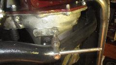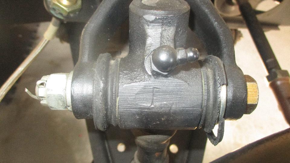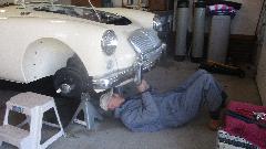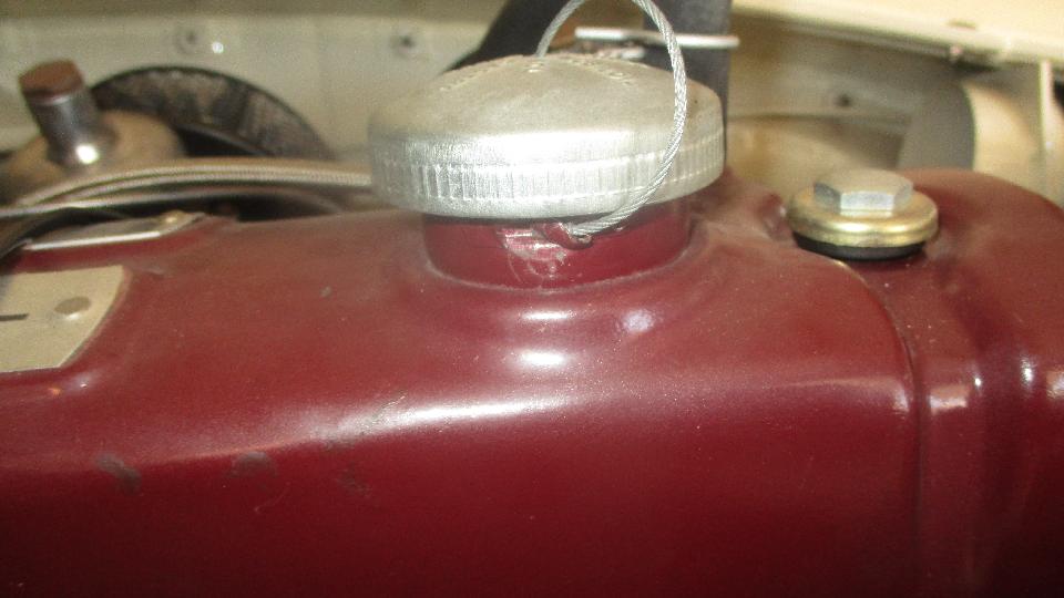 Early on George was under the car, I suppose installing the horn. I got a shot of the rubber seals on the suspension trunnions, fully deteriorated in storage, never having been touched by grease or sunlight. Those will have to be replaced again before it hits the road for serious. Found a good time to attach the oil filler cap lanyard to the valve cover.