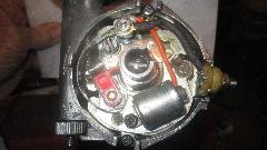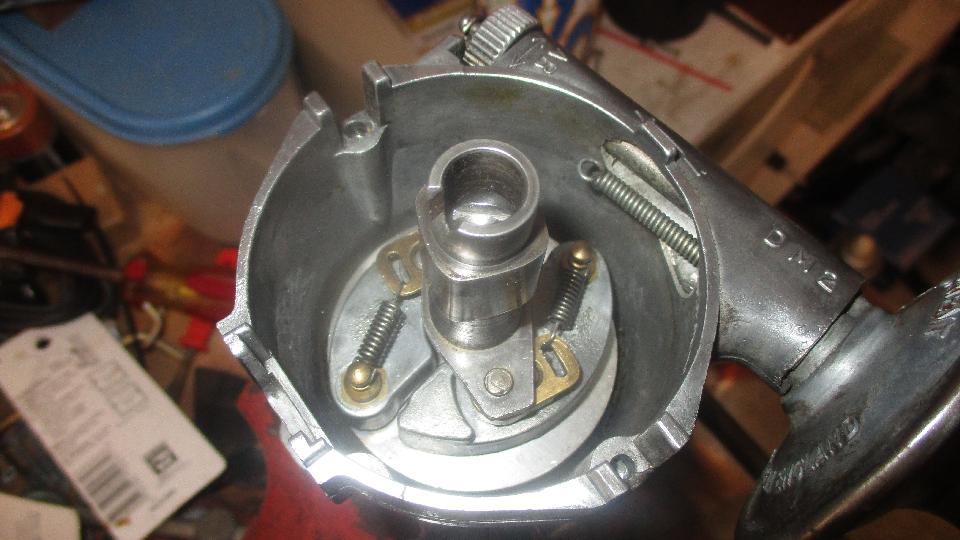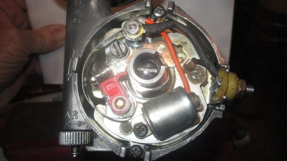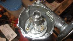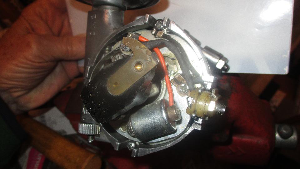 Next task was assembly of the distributor, which was a hand full of loose parts in a box. Nice little jigsaw puzzle, not too difficult, except for the power input flex wire. This was a new part with same size small hole in the eye connector tab on both ends, and it was a bare stranded wire. We had to use a Dremel tool to enlarge the hole on one end to fit over the nylon shoulder insulator for the points connection, and add shrink tubing for insulation.