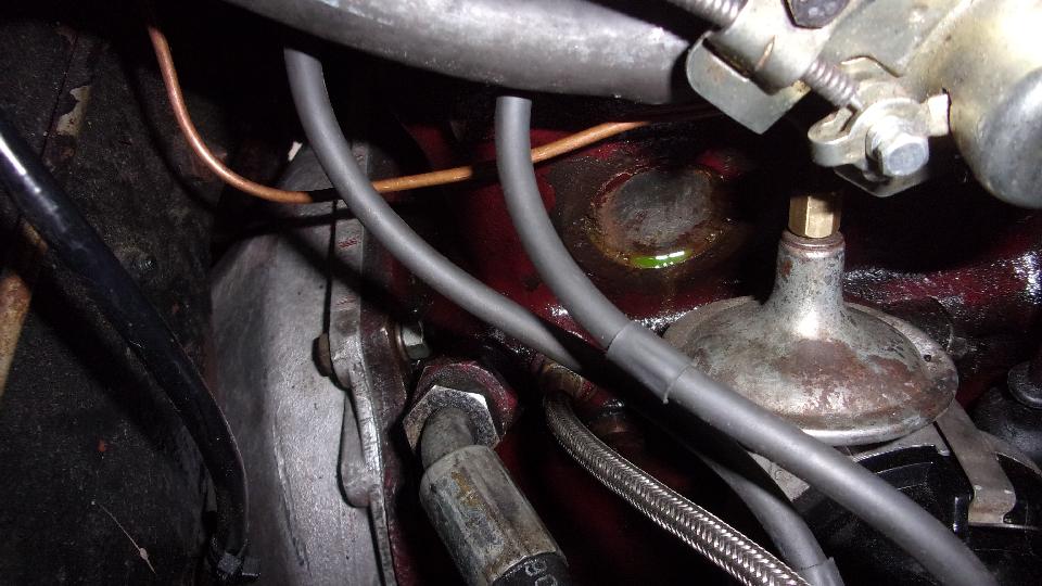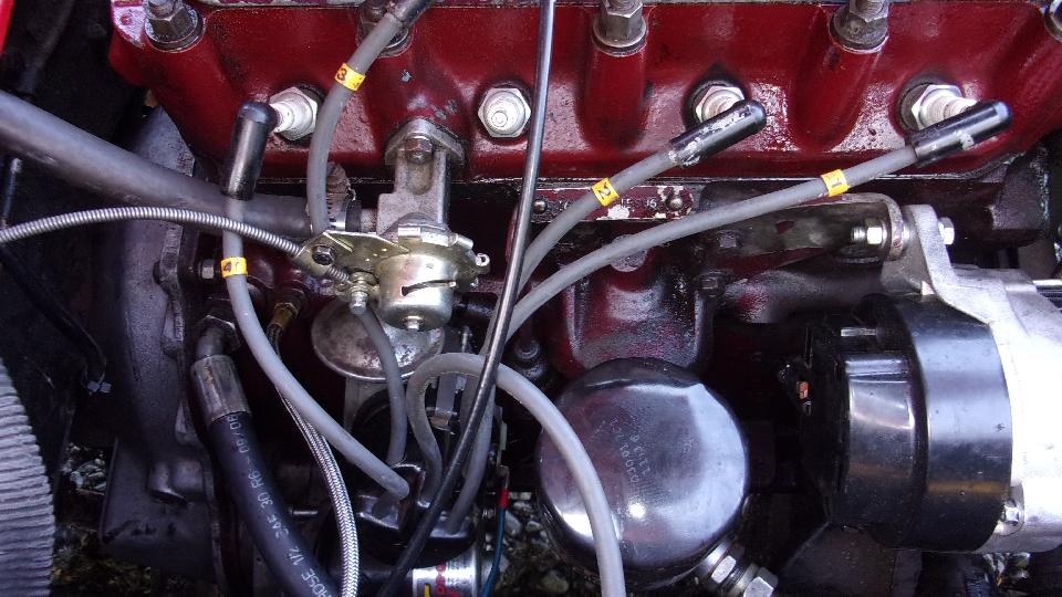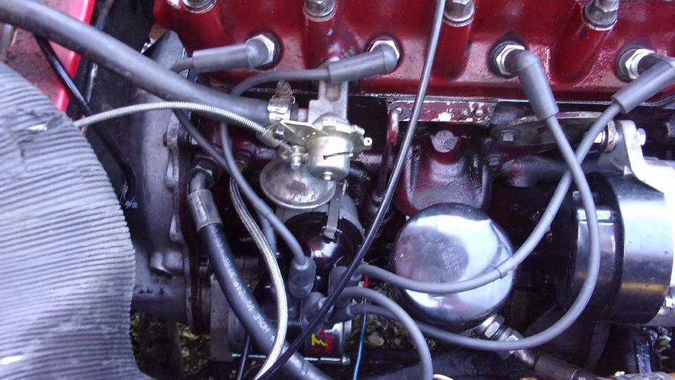 A little up the road a spark plug wire fell off (for the third time), so it was time to ditch the vintage plug connectors. This was the reason I bought the top-entry distributor cap yesterday. Installed the top entry cap on the Lucas distributor, and swapped in the HT wires from the Mallory distributor, and good to go.