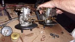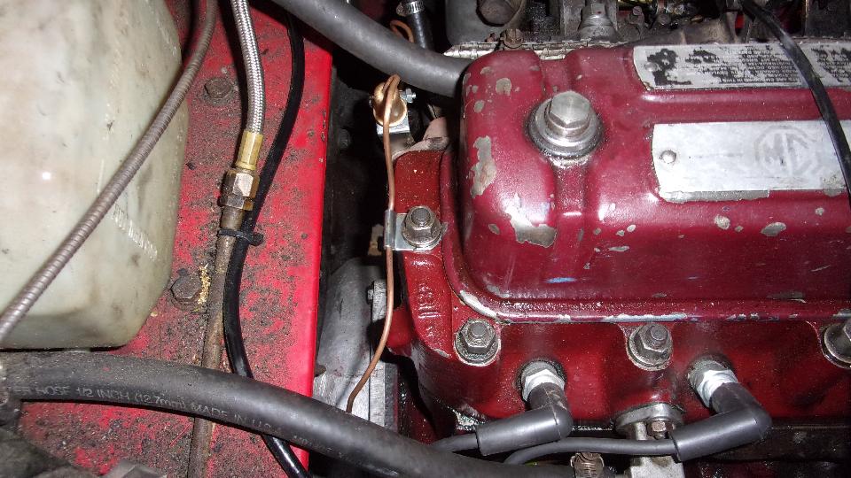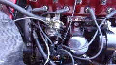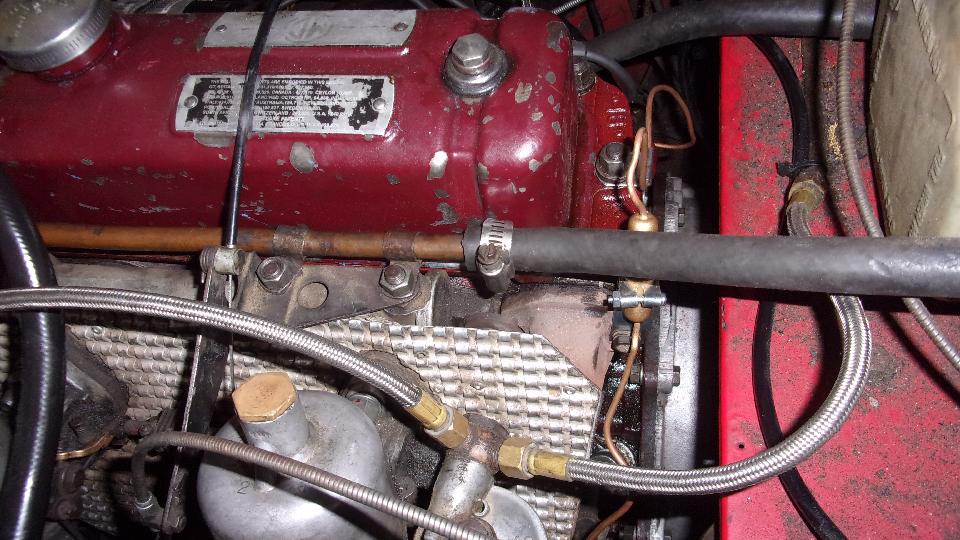 With a bit of time to spare, we set about installing the vacuum advance pipe on my car, which was needed to go with the original Lucas distributor I just recently installed. This involved a fairly quick R&R of the carburetors to assure easy access to screw the pipe into the bottom of the rear carb, as well as routing of the pipe toward the rear for best service access. Yes, I cheated a bit and put the fuel separator bracket on the rear manifold bolt rather than the second from the rear, but that is for ease of access for future maintenance. I haven't driven it enough yet to know if it improves driveability, but at least hoping it improves fuel economy.