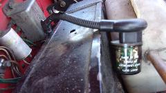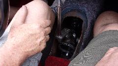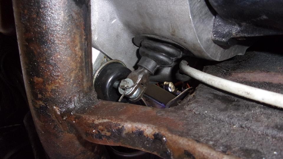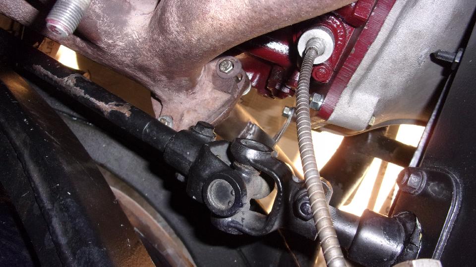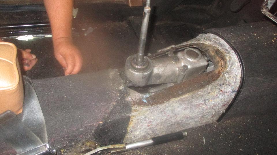 On the other side, finish exhaust hook up, intake manifold, speedometer cable, heat shield, carburetors and linkages. Up front, radiator with a new lower hose (less than one year old but looking quite bad), fan shroud, and fresh coolant solution. Then the fun of installing the gear shift extension assembly (without losing the split bronze bushing inside), scraping off old cork gasket, installing new rubber gasket (with a few misaligned holes) and the tunnel cover (with the eight pesky little screws). Finish this off with new rubber shifter boot, good old wood shift knob, stuffing the tunnel center carpet back into place, and putting oil in the gearbox.
