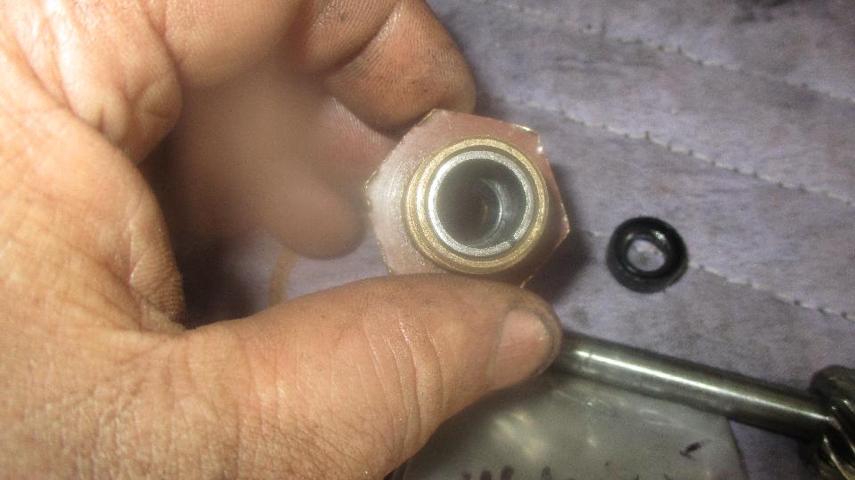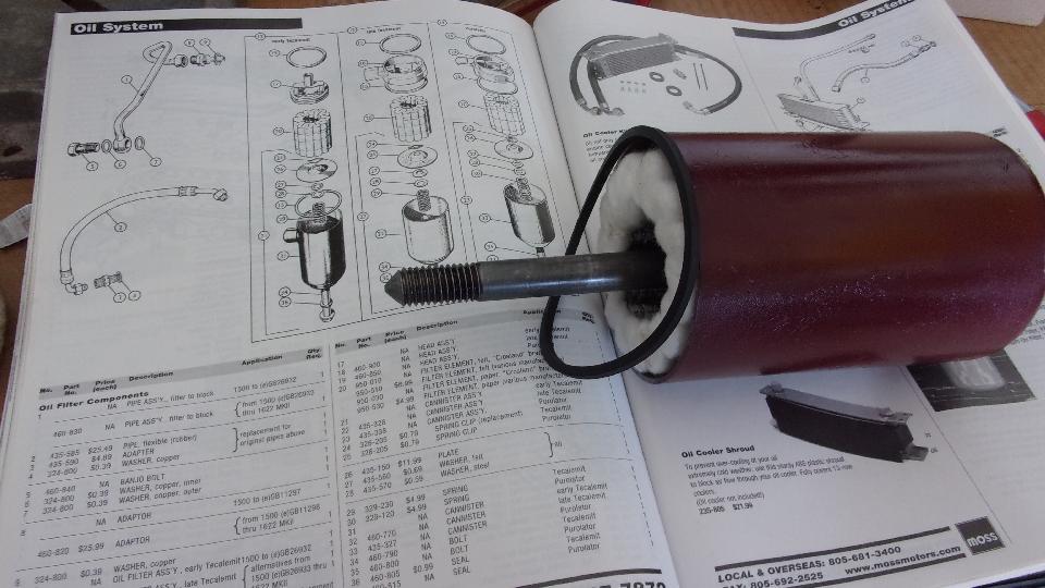 mat on the forecourt. We were here before, last time to borrow the shop space to install a replacement differential in our MGA (still working nicely). First business today was checking out the new felt oil filter, finding all of the required parts to go inside of the canister, but also discovering there was a splash plate missing from the filter adapter head. Bummer. Apparently this car has been running with a dysfunctional oil filter for lots of years past. Will need to fix that before running again.