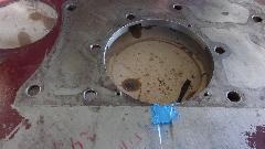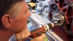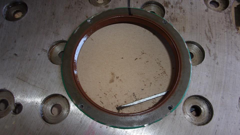 The new seal had been previously modified to remove most of the shell leaving only the flange on one side, but it had not yet been drilled for the mounting screws, and the rear plate also had not been drilled yet. Procedure here was to temporarily install the engine rear plate, then place the seal in position using the slip ring as a guide to center the seal. Locate the screw positions (roughly), and center punch where we wanted the screws. Since we would be drilling in situ, exact screw locations are not critical. This only comes into play if you need to change the seal later, in which case the new seal screw holes need to be drilled in matching locations. We began by drilling small pilot holes, then drilled the clearance holes in the seal flange, then drilled pilot holes through the rear plate (slow going with the small drill bit), followed by drilling out to tap drill size. The plate was then removed for hand tapping the #8-32-UNF threads. Finally flip the plate over and apply some blue stuff to plug the original drain slot in front side of the rear plate.