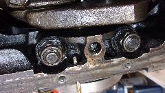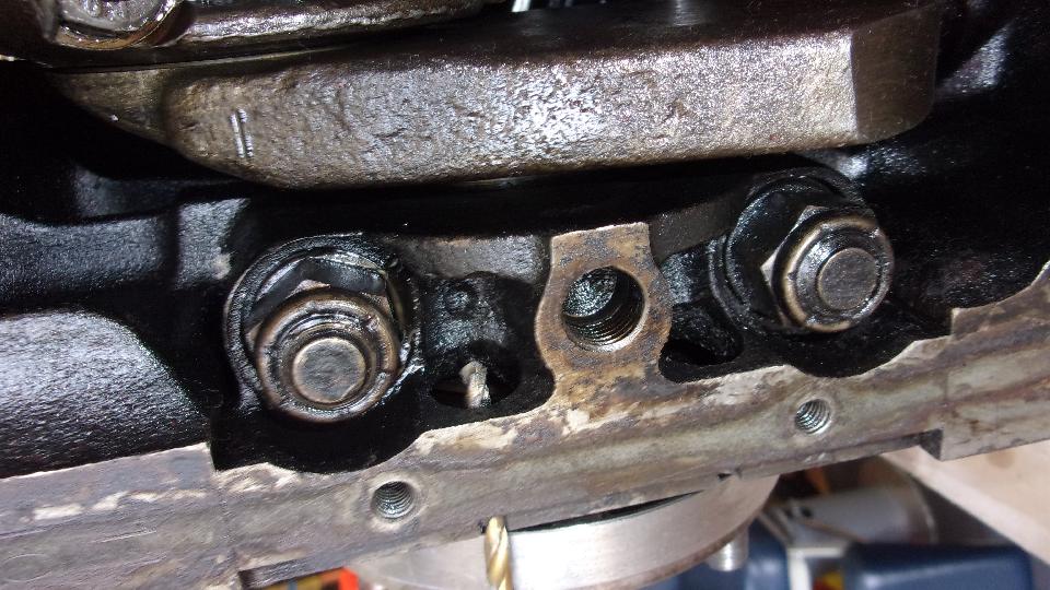 Then we needed to drill two small oil return drain holes in the rear main bearing cap, which would have been easier if it was done before installing the slip ring. Be very careful to drill in exactly the right location just above the cork seal, and do NOT touch the polished seal slip ring in the process. Slow going with a tiny pilot drill first with frequent stops to clear chips and oil the drill bit. Final drill through with finish size drill bit. Picture below right shows the 1600 type rear main bearing cap with two drain ports and no center drain pipe.