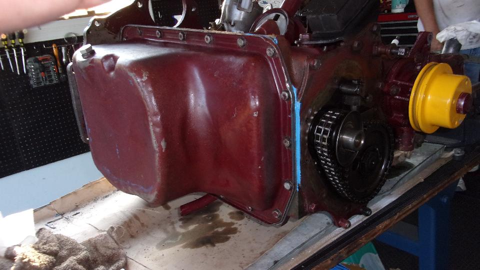 We placed the new paper gasket on the plate and used a razor knife to trim around the enlarged center hole. Leaving only a thin web of paper at the bottom, we used a little more blue stuff to assure a good seal there in assembly (over the original style cork seal). The rear plate was then installed, leaving lock washers off of the three bolts where the bolt heads need to fit behind the seal flange. Secure those three screws with a drop of thread adhesive. The new seal with only one side flange would be secured with button head screws and needs some sticky stuff to seal between the flange and the plate. To avoid getting globs of blue stuff inside to interfere with the garter spring and lip seal, we placed a thin cardboard ring inside of the center hole of the rear plate, then filled the counterbores with blue stuff. Leaving that to cure overnight, seal would be installed later. It was time to clean out and reinstall the sump. We also spent a little time finessing the felt seal ring in the timing cover. Looks like this will be ready to drop into the car during a club tech session come Saturday.