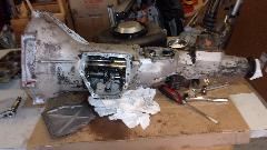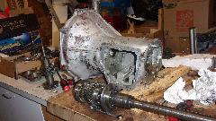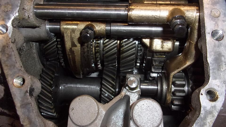 Looks like it has all of the original gear teeth, 3rd and 4th synchronizer rings were in good condition, only 2nd gear synchro needing to be replaced. A pair of pry bars revealed a small wiggle in the laygear, not a lot but indicating some wear on the layshaft (pretty common with these units). So we proceeded to tear it apart starting with removal of the shift interlock arm up top, then lock it into two gears at once while we removed the big nut and output flange at the rear. The rest was like Tinker Toys when we were kids, just try to keep the loose parts organized as it magically disassembles itself. Clutch release arm, front cover, rear housing, rear seal, shift rods, shift forks, reverse gear, laygear shaft (dropping laygear into bottom of the box), mainshaft out the back, input shaft out the front, then lift out the laygear. Finish by retrieving lots of needle rollers that inevitably fall into the bottom of the housing.
