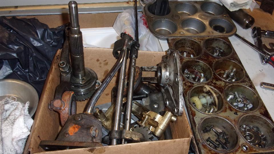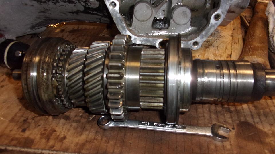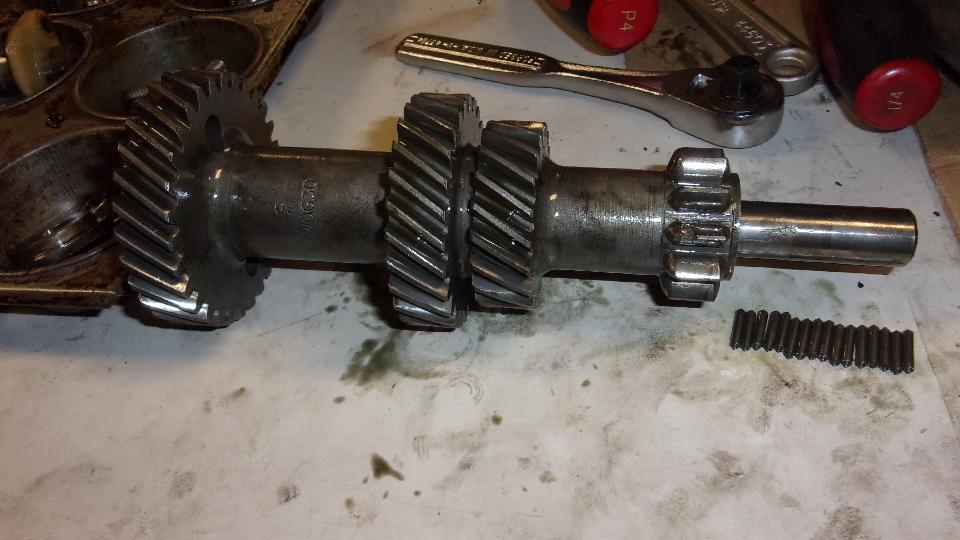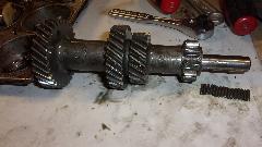 Only 90 minutes for disassembly including lots of time for scratch and sniff and explanations about how everything works. Remember I said keep the loose parts organized. I recon we had access to most of what was needed, except no replacement layshaft handy. A subsequent check with Moss Motors revealed that the good one was out of stock. Bummer. Time to settle back and consider options. Tripped out for a nice dinner at a local bistro, reassembled the mainshaft parts so they would stay in order, more chat about parts to be ordered before reassembly, and next thing we knew it was well past 10-pm. Seems like we managed to kill about 8 hours for the 1-hour disassembly job and subsequent discussions.