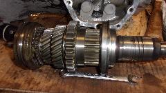 Once disassembled it was apparent that the layshaft indeed had some wear and wants to be replaced. Also of the three needle bearing assemblies on the layshaft, the single rear bearing roller set was showing brinelling marks on the rollers, so at least one bearing needed to be replaced. Not too long to unlock and remove the 3rd gear retaining thrust washer from front of the mainshaft assembly, then pull off 3rd ger, followed by pulling off 2nd gear, which forces extraction of the 3rd gear bushing and intermediate bronze thrust washer. That done, the worn 2nd gear synchro ring is readily in hand, and we could proceed with reassembly (if we had the parts).