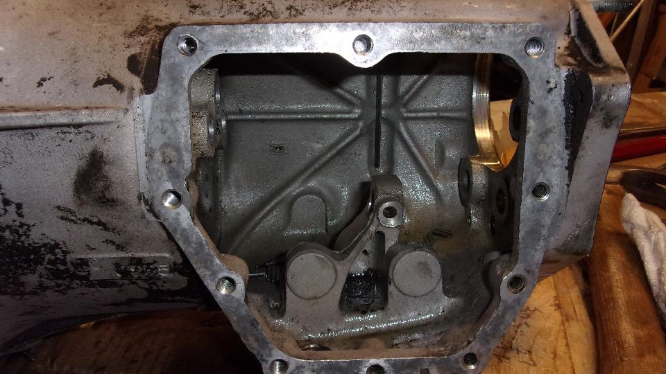 Big day today, determined to get the car back on the road. Early morning trip to O'Reilly Auto Parts to pick up the National seal(s) for gearbox front cover (also snatched up a set of stubby end wrenches while there). Not long to change the front cover seal and install the front cover (with bearing shims). Installed a replacement clutch release arm (good used part carried from Bonita Springs, Florida last December). The prior half million mile part was worn loose in ears, likely a result of rattling a bit for the past two years due to a broken retaining clip. New release bearing, new rubber dust boot, new slave pushrod and clevis pin. A few minutes later it was sitting in the chassis, shortly to couple the sliding joint to propshaft, install rear mount bolt, connect speedometer cable, lift the bellhousing onto a 1-1/2 inch wood block, repack the clutch slave cylinder (because the outside dust boot was ruptured), and remount the slave cylinder.