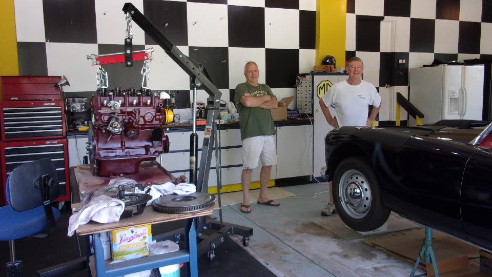 We rolled back up to Crystal Lake, IL today to visit Vic L'Heureux again, to pick up my spare alternator that arrived a few days earlier, and to reassemble Vic's recent replacement early MGB gearbox. Chuck McCallum from Plainfield also came up to observe, lend a hand, get his fingers dirty and learn something, because he has an MGA gearbox to overhaul soon. The party was waiting for our arrival a little after 2-pm.