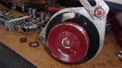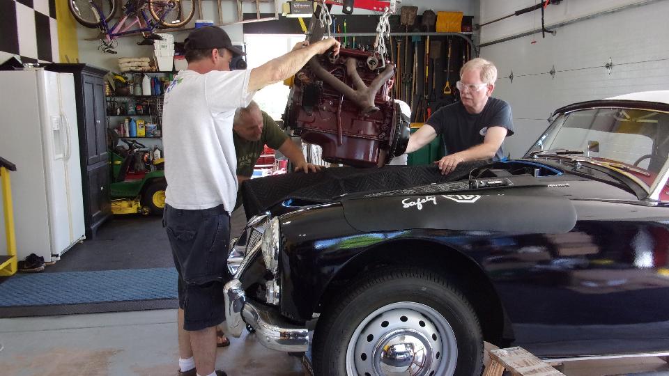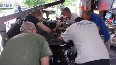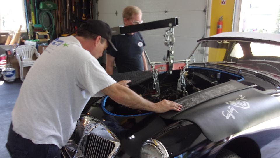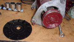 Back to visit Chuck McCallum in Plainfield, IL. This started out as a follow-up to Wednesday's rear crankshaft seal installation. By now the rear seal was finished as well as the timing cover, and the engine was ready to be installed in the car. This was slated as a CMGC club tech session, only announced at the Monday club meeting, so short notice limited it to a few friends. A quick little side job first, needing to install the cooling fan on the generator (after someone at Moss Motors told him it wasn't needed, bah, humbug).