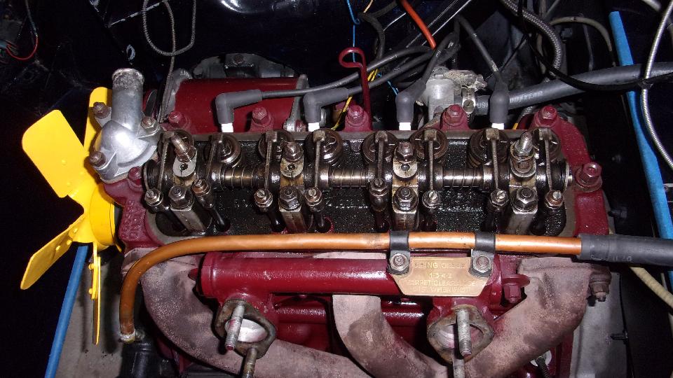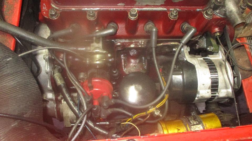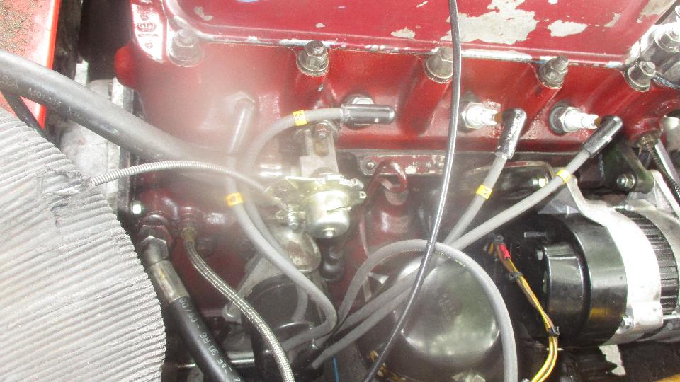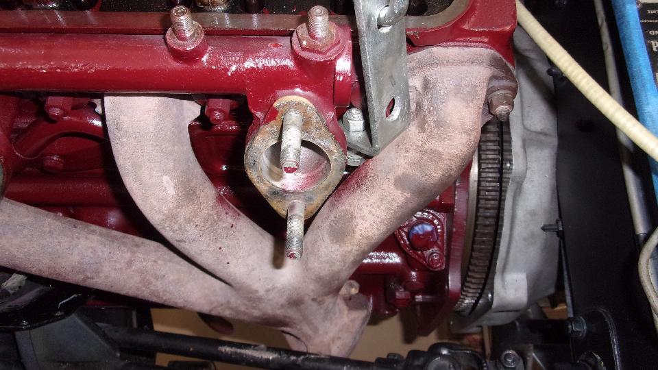 Good progress, too busy to take pictures, but insert the engine, lash up the bellhousing bolts and starter motor, and get the engine mounts bolted down (with the ground cable, thank you), the draft pipe and valve cover. Exhaust manifold was a bit of a fiddle, requiring rat-tail filing the the front and rear holes to accommodate the normal and expected front to rear shrinkage (the second time in two years. Notice crack in the manifold in the rear "Y", two years and two weeks since it was installed (going to have to notify Moss Motors about this issue). Closing in on the finish, exhaust to manifold connection with a new seal, oil cooler hoses, oil pressure signal hose, alternator, water temperature sensor, distributor cap and ignition wires.