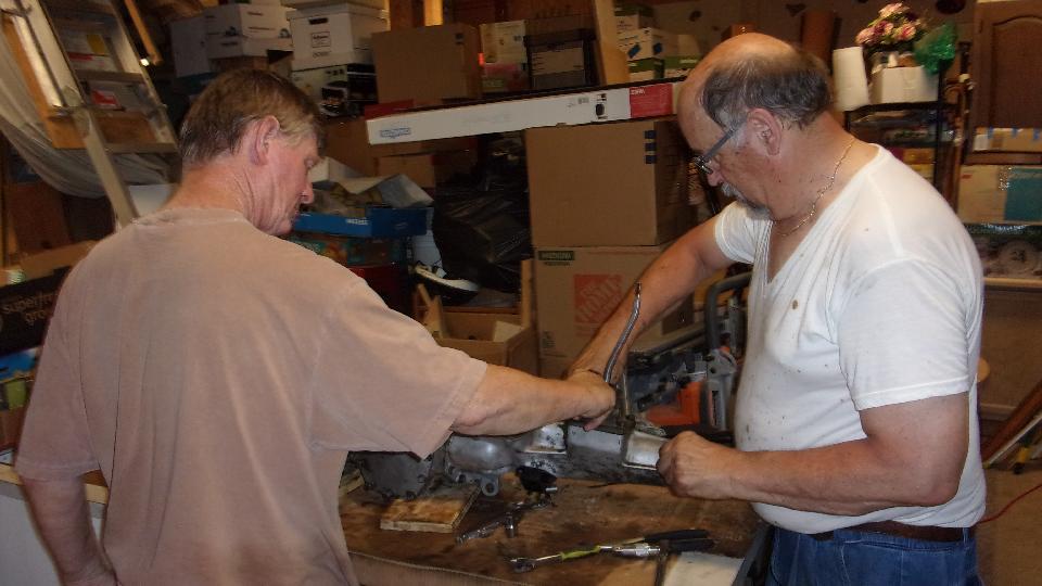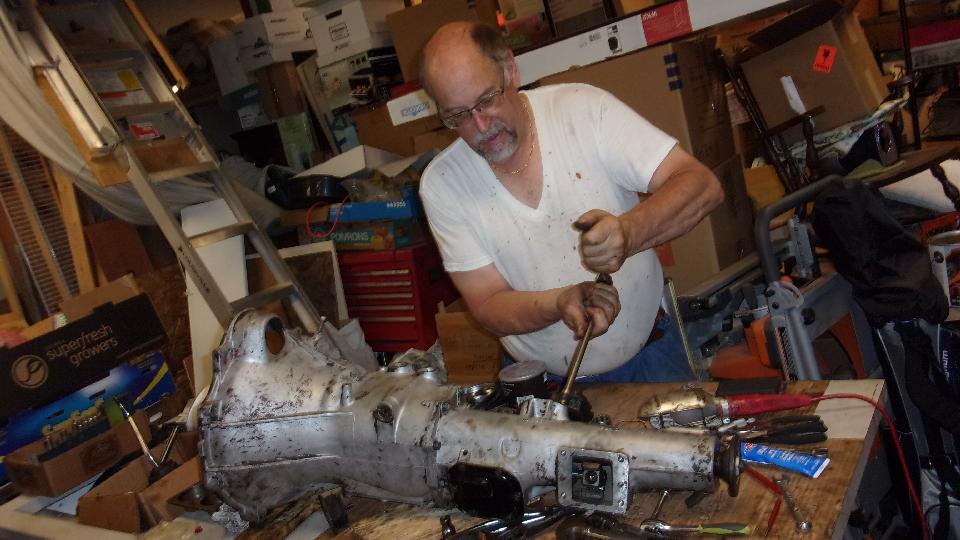 Fifty miles farther north today we dropped in to visit Vic and Penny L'Heureux in Crystal Lake, IL. Last time we were here (2-1/2 years and 90,000 miles back) we were rebuilding my gearbox. Today we would be disassembling a spare early MGB gearbox for inspection to see what parts would be needed for rebuilding it. Started by removing side and top covers for a peek inside, and counting teeth in the speedometer drive gears to be sure it was the correct model to match the speedometer in Vic's car.