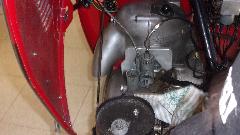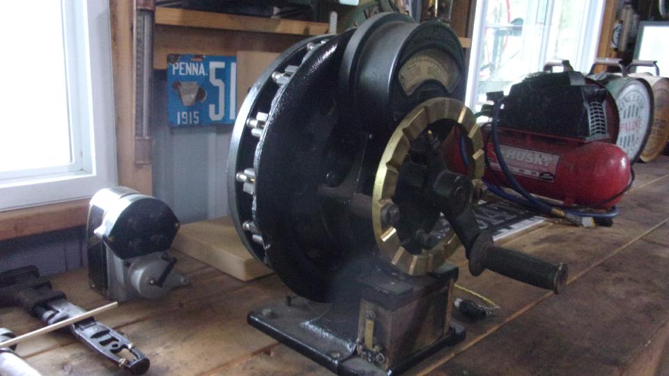 Among a bench full of tools was this hand cranked magneto and coil tester, currently hooked up to fire a spark plug. Of course it still works. Give it a crank and watch the needle move. All jolly good fun, but then it quit raining and the party was over.