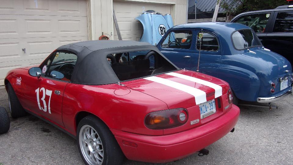 More club research and scheduling, but late in the day we had a visit with David Holmes in Elmira, Ontario. He races 1949 TC and a 1957 MGA (with double articulated body), while his son races an MG Midget and MGA Twin Cam. Too many toys to count, but fun taking pictures. Not sure how the Mazda got into the mix. the baby Austin came with a race prepped 1275 engine, a bit too hot for that car. This was swapped with a 850 engine in a bug-eye Sprite, so now both cars are happy.