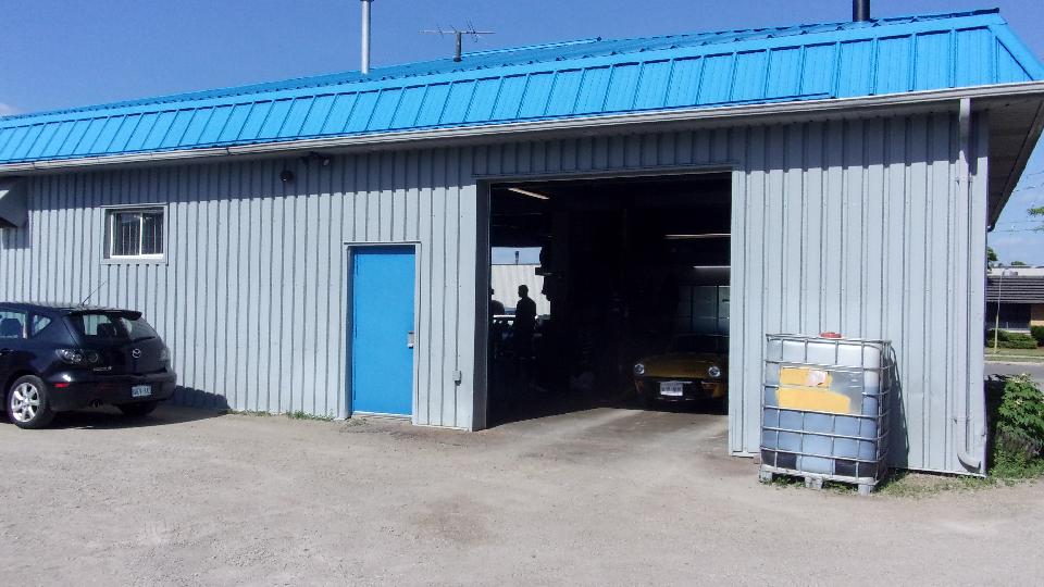 Next up was Fanshawe Motors in London, ON, providing general repairs for most marques. They do mechanical and electrical work, no body or paint work, but they can get upholstery work done at a nearby shop. There were a lot of modern European cars on site, and a number of other vintage cars. We did find a Mini up font, an MGB just outside the service door, and the tail end of an MGA peeking out from inside.