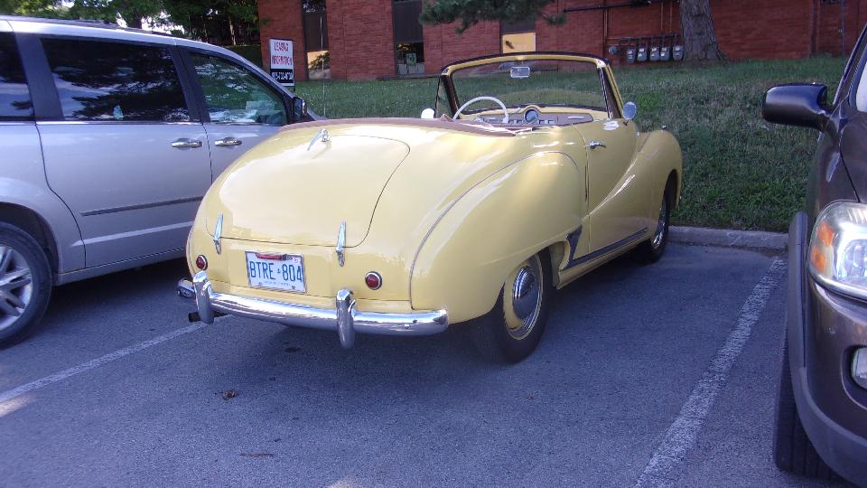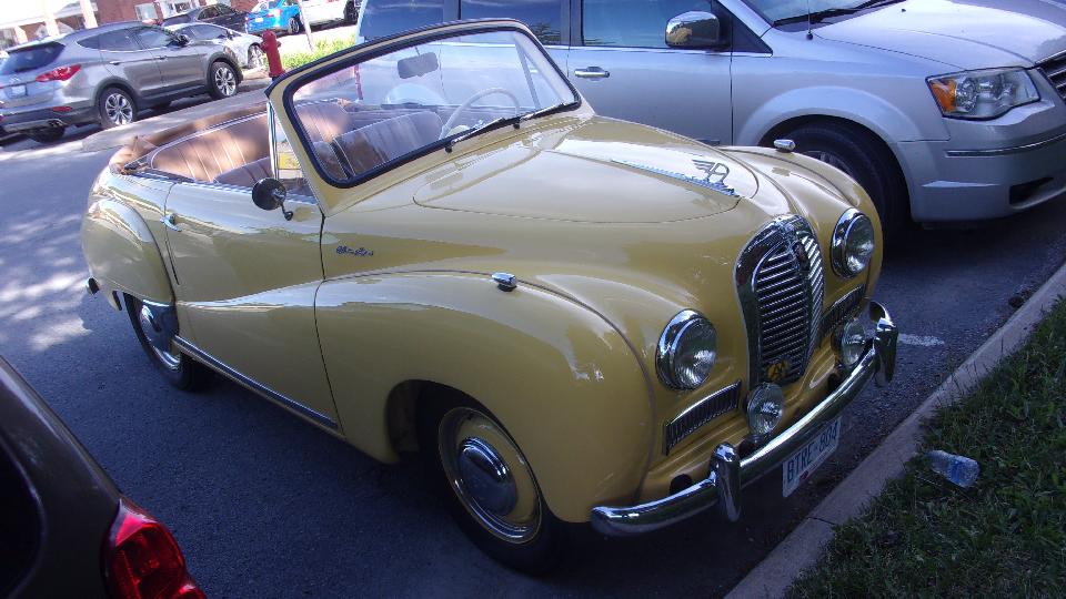 Moved east a couple of hours for an evening meeting with British Saloon Car Club of Canada (Niagra group) in Fonthill ON. Had an interesting walk around the car park, beginning with an Austin A30 (1952-1956). On the side, "Austin of England". On the nose, "Austin".