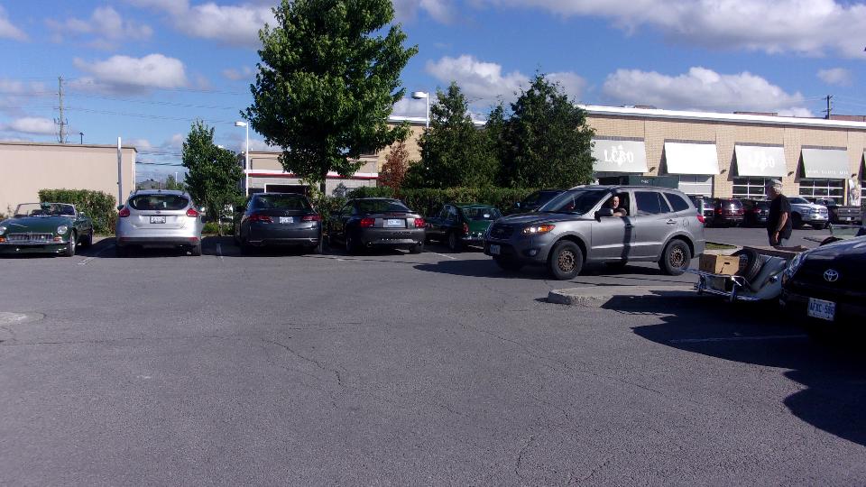 Sitting on a WiFi spot in Waterloo, ON today, we had a couple of walk-ins to chat about the car. Then navigator found a laser printed note on the windscreen from a bloke in the industrial building next door. While checking the Facebook page of Waterloo British Car Club, he noticed a photo of out car sitting out front with some speculation that we might (maybe) have a car problem. I could not immediately post a response on the Facebook page, so I called the bloke who had left the note. This fellow had some interest, because his boss had a number of vintage British cars.