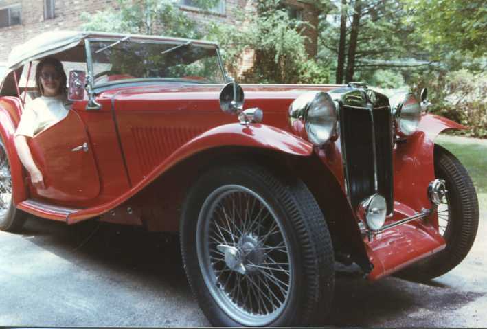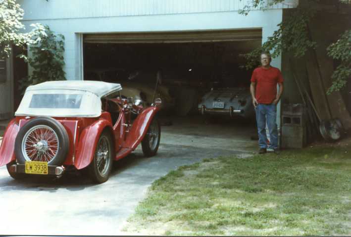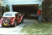 By evening we're fully rested, up and at'em, heading for the south side to see Tom and Eileen Jevcak for a chat and to thank Tom for his efforts at conjuring up a crankshaft. Tom also has some nice wheels around; a bit more than will fit in his garage I presume. He has an MGT outside giving it a spit shine when we pull in, and more under the roof.