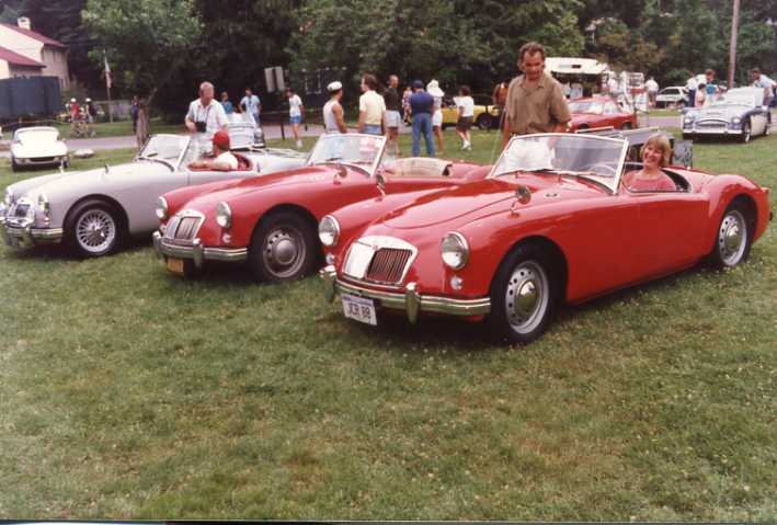 Somehow 7:30 am finds us pulling into Jan Roy Horner's driveway in Westford, Massachusetts, just north of Boston. We find the "MG PARKING ONLY" sign on the front of her garage and put it there. It couldn't be more fair; reserved just for us! Pounding on the door and teasing her gigantic dog into barking up a storm finally brings Jan out in her bath robe, wet feet and all. We really are sorry about getting you out of the shower Jan. But she takes it well and is happy to see us, as we're all old friends. Jan used to be President of the Chicago Area MGA Club until she moved out here about a year ago. I understand that on her first appearance at a meeting of the Bay State MGA Club she was promptly interred as their President, and she's still smiling?