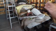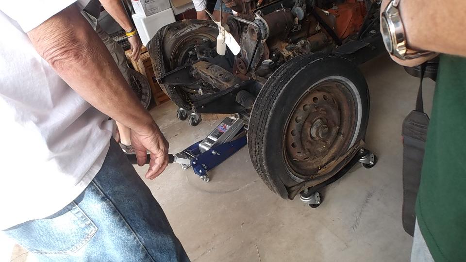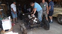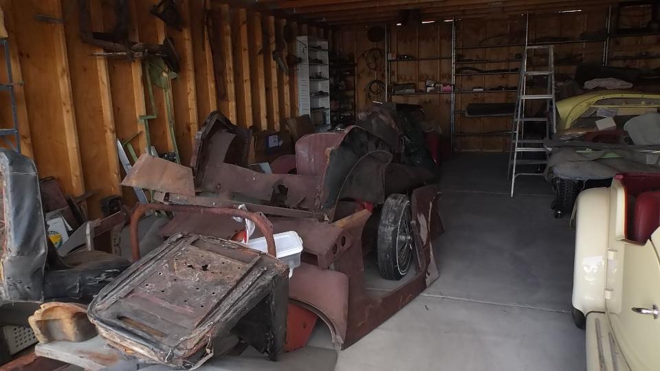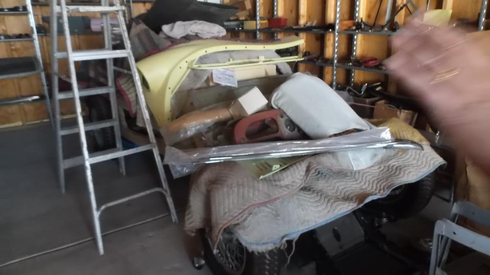 In the far rear corner was another TF chassis, mostly finished. It had a recently restored wooden body tub and lots of light yellow primered body parts hanging around the garage. We moved this one to the RR corner of the garage, and set all of the associated parts on or nearby. By day's end one of the local club members had arranged to buy this one with the intension of finishing the restoration.