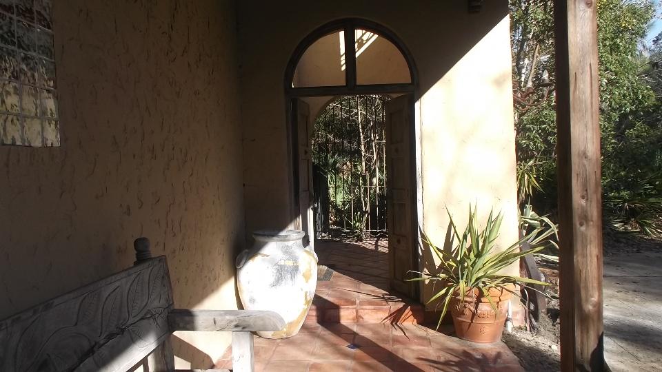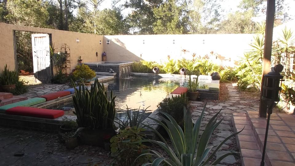 The living room, office and one bedroom have patio doors facing onto the central courtyard with swimming pool. To the left of the courtyard a "small" side yard leading to the "toy shop".