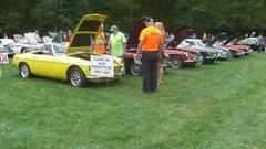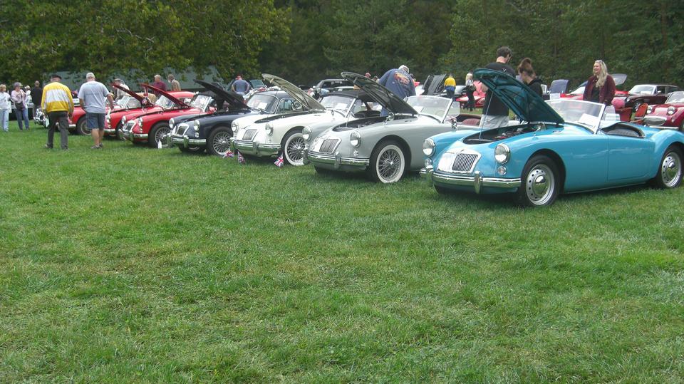 Running late, so we grabbed breakfast on the fly, thrn met the Darrell's Garage gang at the Village Green Family Restaurant in York, PA. Taking some side streets, our first stop was Ore Valley Elementary School in York Township, PA to collect some more cars. One LBC died in the street obstructing traffic, pushed it into the car park at the school for more attention before moving on. That fiasco is documented in our travel log. Half hour later we were in line to register for the car show, and soon parked up in line with other MGA.