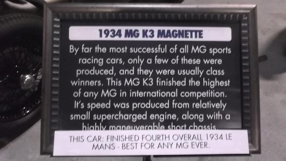 have a rich racing history, and have won some significant racing event. The first item of interest is the only MG in the museum, a 1934 MG K3 Magnette that placed 4th overall in the 1934 24 Hours of Le Mans. We were honored to be given a tour of the car by Kevin Kelly .