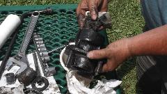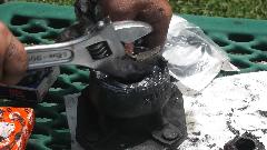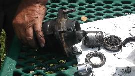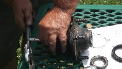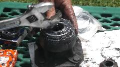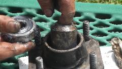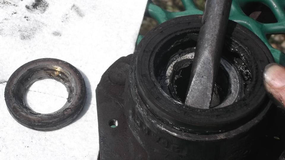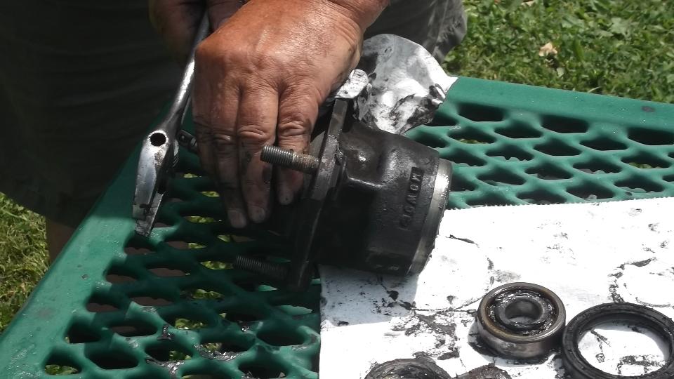 Use a wrench socket and extension and handy hammer (12-inch Crescent wrench) to punch out the outer bearing and bearing spacer.