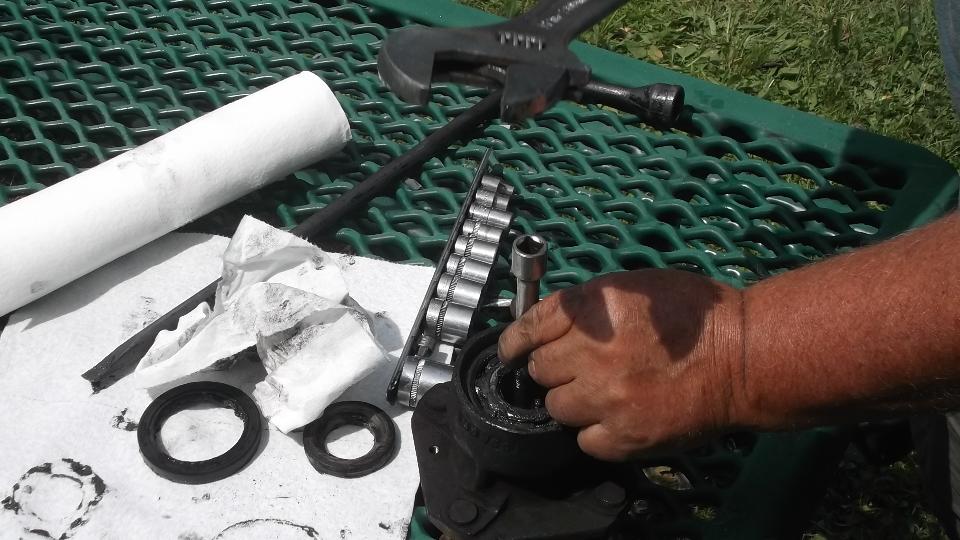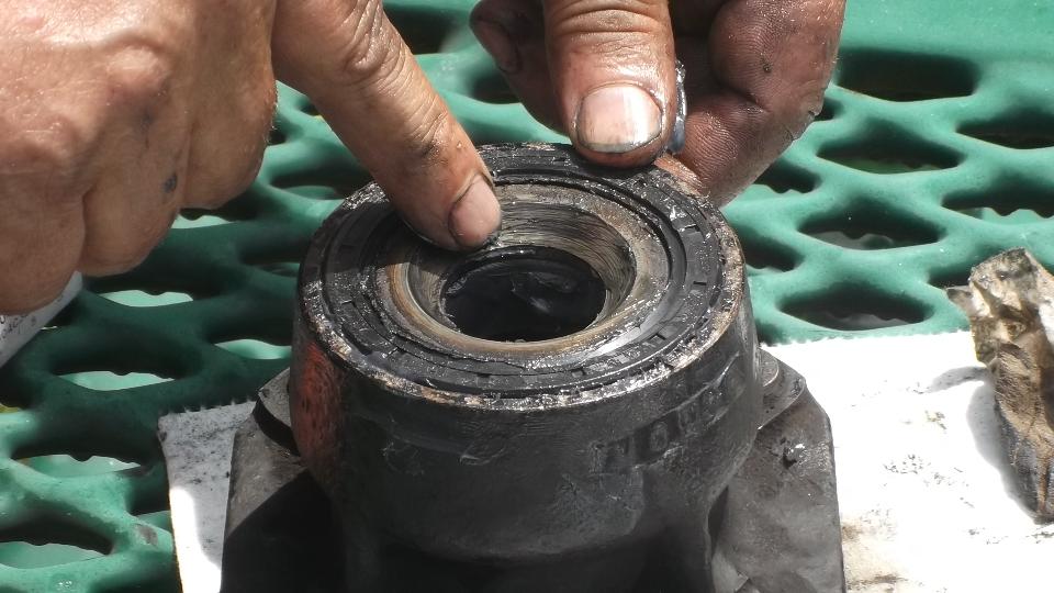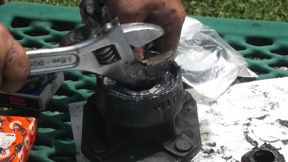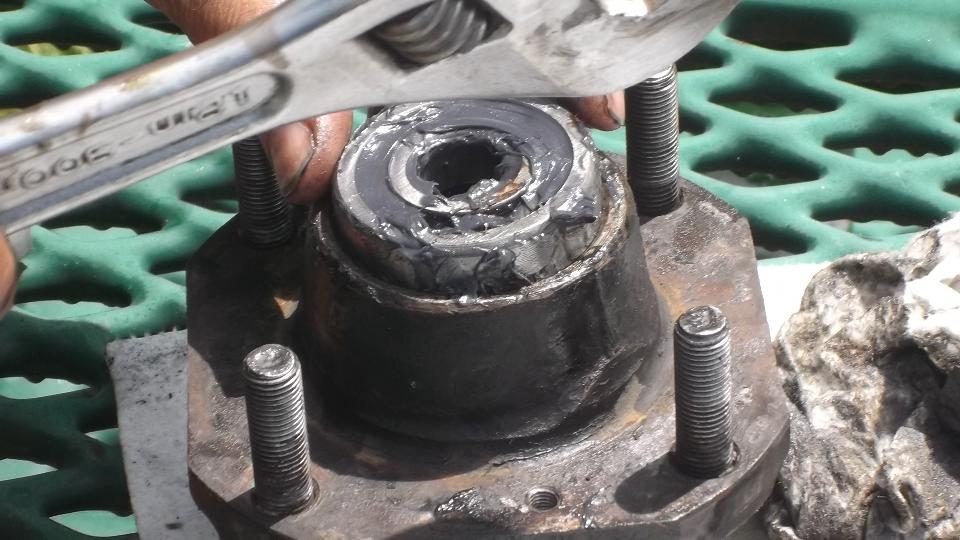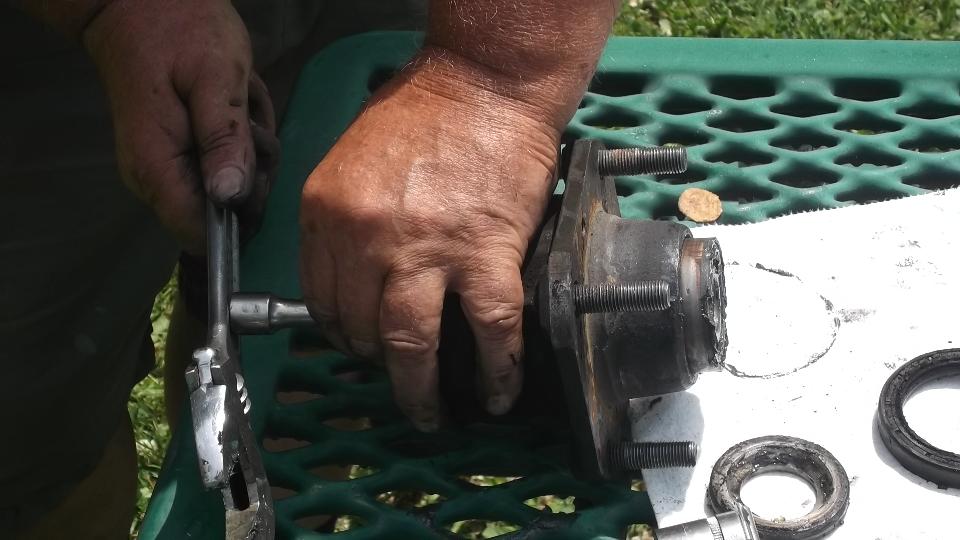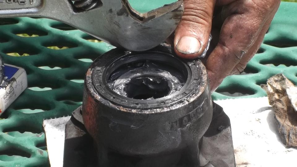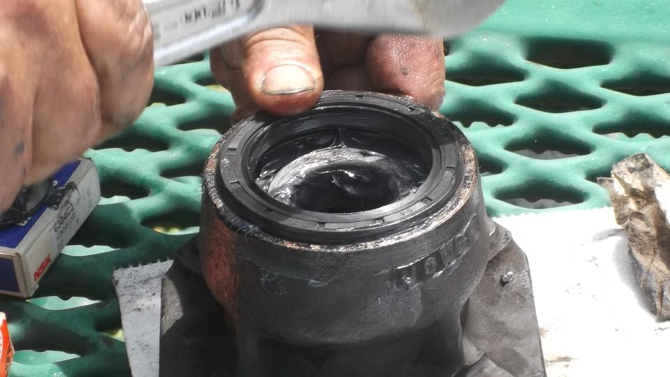 Flip the extension around and use it to tap out the inboard bearing. A little wiggle test shows the excess clearance in the bearings. They were not about to fall apart, but the odd tire wear was enough to prompt me to change the bearings.