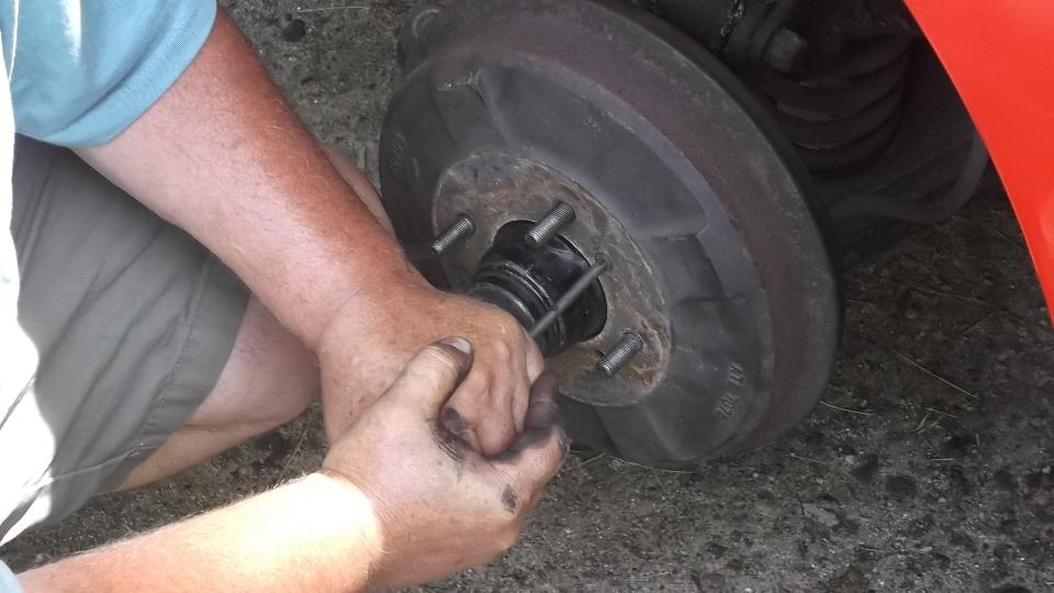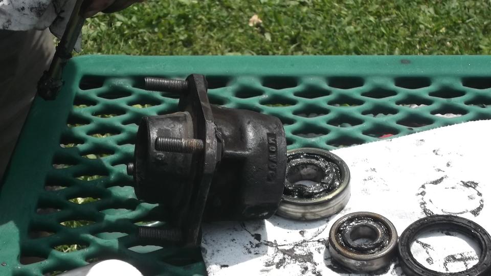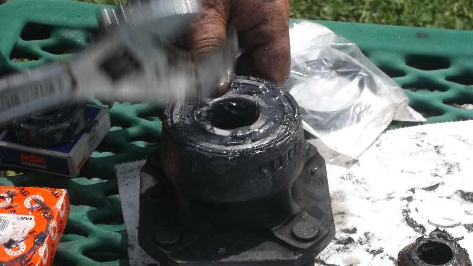 A little petrol siphoned from the MG is good for cleaning the hub. Then a little fun packing bearing grease completely through the new outboard bearing.