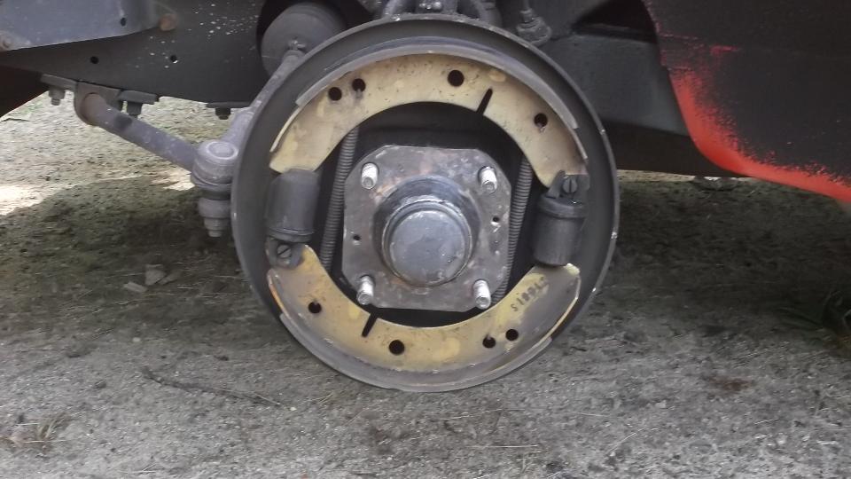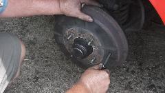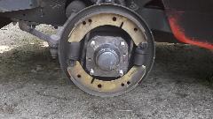 Tap the grease cap home, install the brake shoes and brake drum (including two flat head screws for disc wheel drum brakes).
